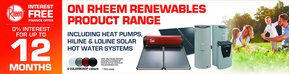 For a limited time Australian Hot Water your local Rheem Solar & Heat Pump Water Heating Specialist can offer for approved retail purchases interest free terms. Simply choose from the variety of Rheem renewable product range . Select either a Roof mount high line solar ,Ground tank split system or a Heat Pump and we can help you purchase these products with either 6 months or 12 months – interest free terms . To get your home into energy efficient water heating, Call your local Australian Hot Water branch on 1300 132 113 to arrange a free quote and fine out more about the terms & conditions of this promotion.